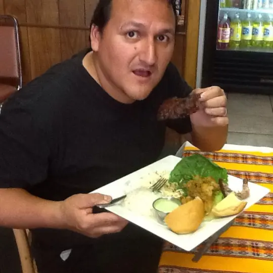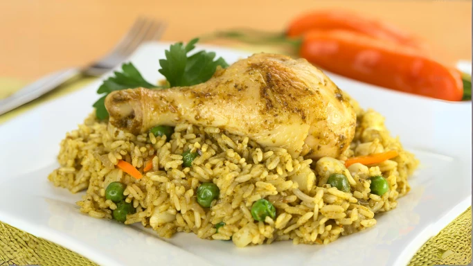 This enticing combo plate features tender beef cooked in a flavorful cilantro sauce, served alongside steamed rice and beans.